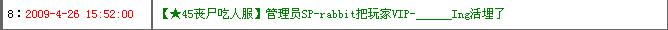 | -- 作者:OvErKilL -- 发布时间:2009-04-26 16:09:00 -- 7:2009-4-26 15:53:00【★45丧尸吃人服】管理员SP-rabbit停止惩罚玩家VIP-______Ing 按錯了吧 |