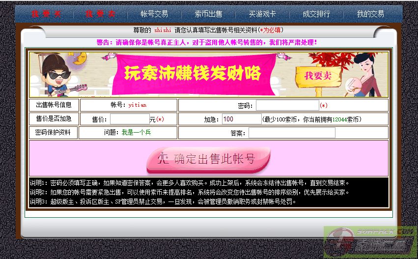 | -- 作者:shishi -- 发布时间:2016-12-06 17:32:00 -- <B><FONT color=#FFFF00><SPAN style="BACKGROUND-COLOR: #EE00EE">《索沛交易系统》正式上线!!!</SPAN></FONT></B> 经过老大日以继夜的调试,《索沛交易系统》今天正式推出! 请大家点击这个地址进入:http://cs47.com/new_plus/shop/ 特意推出5个中文名帐号给大家装逼用,售完即止(每个帐号里面有索币的哦,听说老大后面还要改成可以申请中文VIP) 1:帐号买卖,大家可以自由出售,公平交易,官方保证,杜绝骗子。(此功能已开通) 2:游戏卡,大家用不完或者赠送的游戏卡,也可以来这里卖给需要的玩家。(此功能制作中) 3:索币,如果你有多余的索币,也可以来这里兜售。(此功能制作中) PS:即日起论坛禁止发布买卖帖子,请移步到交易大厅,否则当骗子处罚。 此主题相关图片如下:![]() 此主题相关图片如下:![]() 此主题相关图片如下:![]() 此主题相关图片如下:![]() 此主题相关图片如下:![]() 此主题相关图片如下:![]() 此主题相关图片如下:![]() |