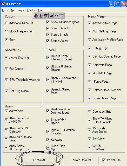 ⑥下载下面的NVTweak并安装,运行后点“Enable All”按钮,然后返回⑤,请先关闭Nvidia控制面板再打开。