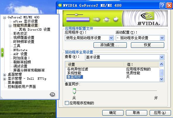 ③进入面板后,选择“性能和质量设置”,在右边那里,找到“垂直同步”,取消“应用程序控制的”,然后把划块拖往关。