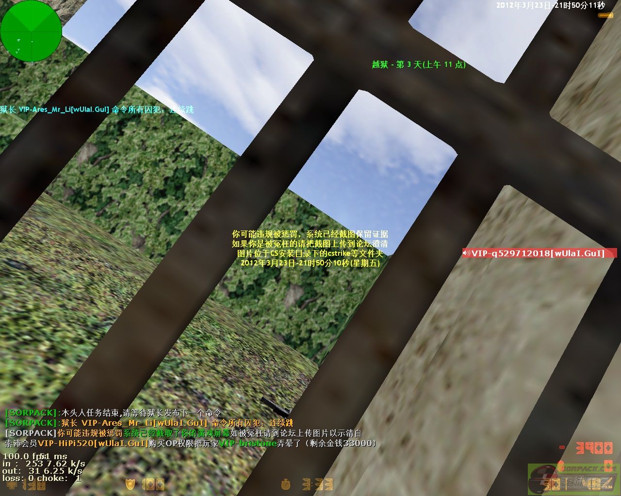 今天被人说透视, 自己蹲在那黑暗的地方以为人家看不见, 老玩家了,你当是菜鸟啊, 去什么地方所以的角落里都会搜一遍。 都警告你了:如果你不怕被投诉,罚钱那你就OP,反正也不是第一次被人冤枉了。现在你拿出证据来, 我哪里作弊了, 哪里透视了?