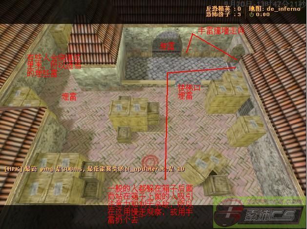这图的CT可以在T洞里下楼梯的外围位置埋下一些雷,有些T会在那里下来偷袭CT。偷袭的那一行字外边最好用一个探测雷,再去偷袭~