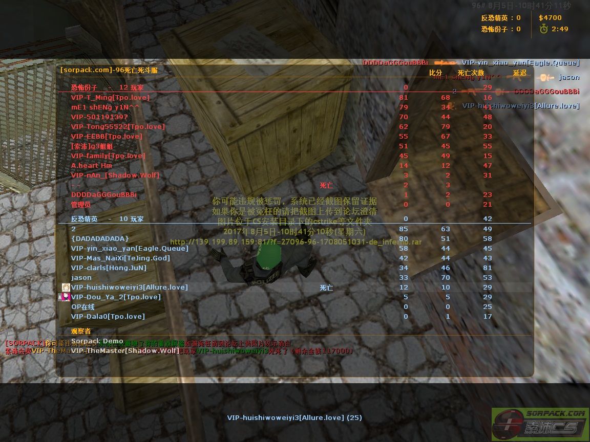 52017-08-05 10:41:00【96死亡死斗服】会员VIP-TheMaster[Shadow.Wolf]购买OP权限把玩家VIP-huishiwoweiyi3处死了[Demo]