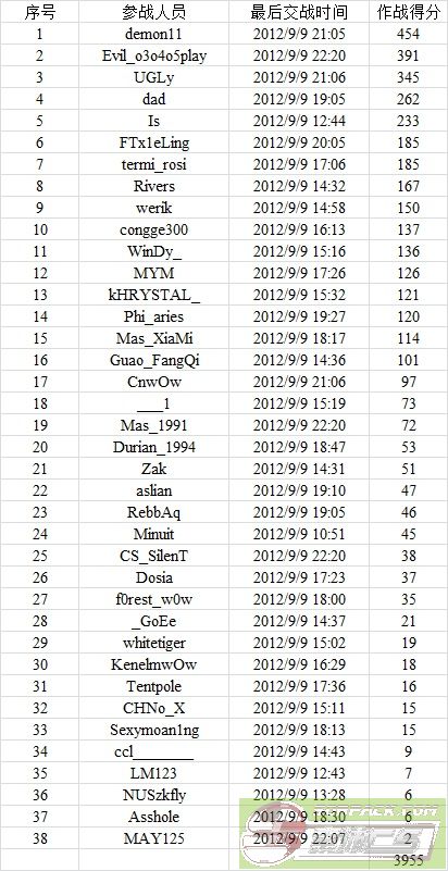 | -- 作者:demon11 -- 发布时间:2012-09-10 16:16:00 -- 9月9日H.E保卫战战绩奖励! 感谢大家,昨天打出3955分,创下战队混战服新得分纪录! 歇会来发奖励