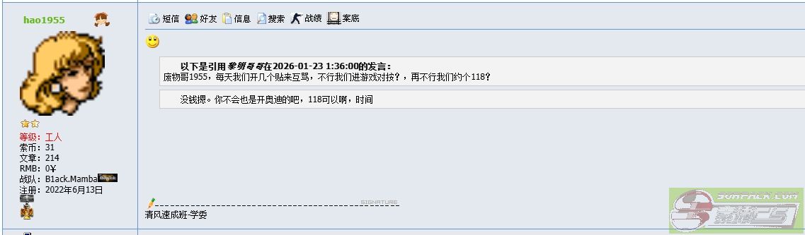 以下是引用zhan_che在2026-01-23 3:14:00的发言: 你让黑曼巴拿头打118啊,黑曼巴里面的成员只有两种,一种是老鼠,一种是匹夫, 他们下辈子都不敢118的, 脚本一关,路都走不直,只会躲下水道吱吱吱。 最近借到钱没。